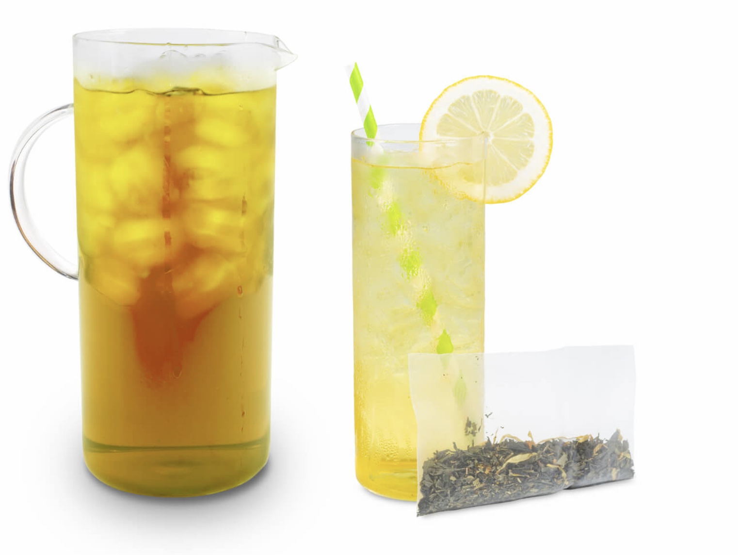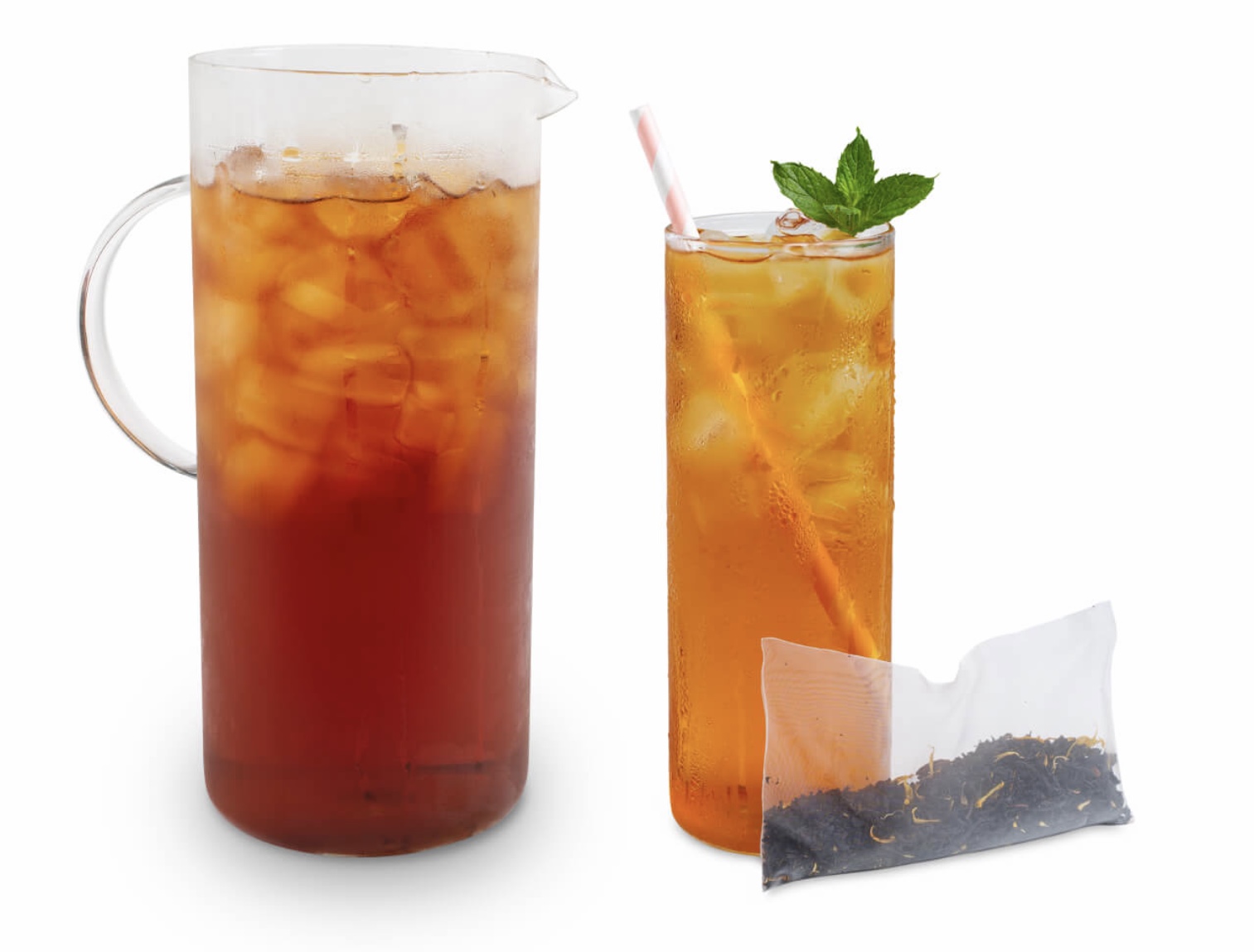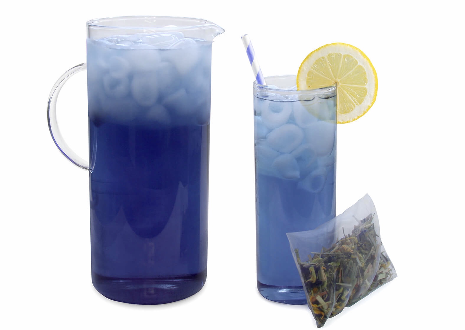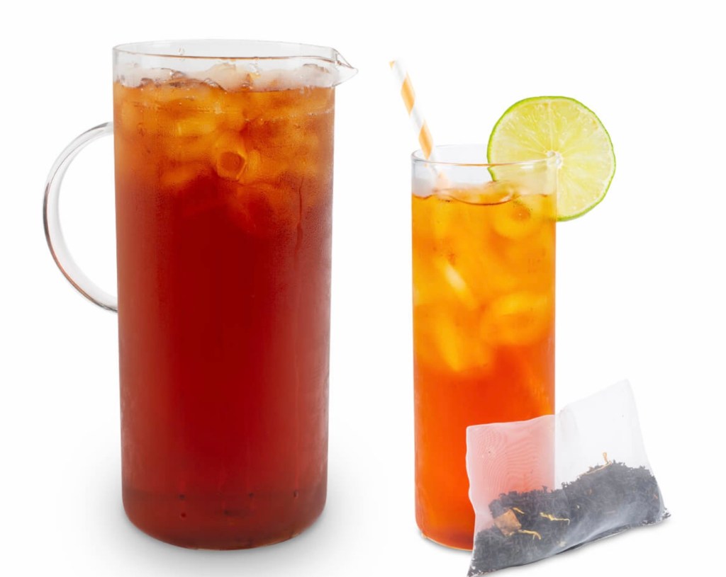 We have five great flavors. Two black Ceylon teas with Mango and Peach. Two herbal teas Papaya Purple and Tropical Blue and a Citrus Green Tea. All five flavors are great over ice. Each package has five pouches. One pouch makes 32 ounces of tea, great for a pitcher of tea at your family BBQ!