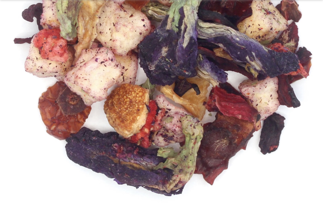 Blended With Hibiscus, Butterfly Pea Flower, Apple Pieces, Rose Hips, Orange, Papaya Flavor, Blueberries, Strawberries & Natural Blackberry Flavor