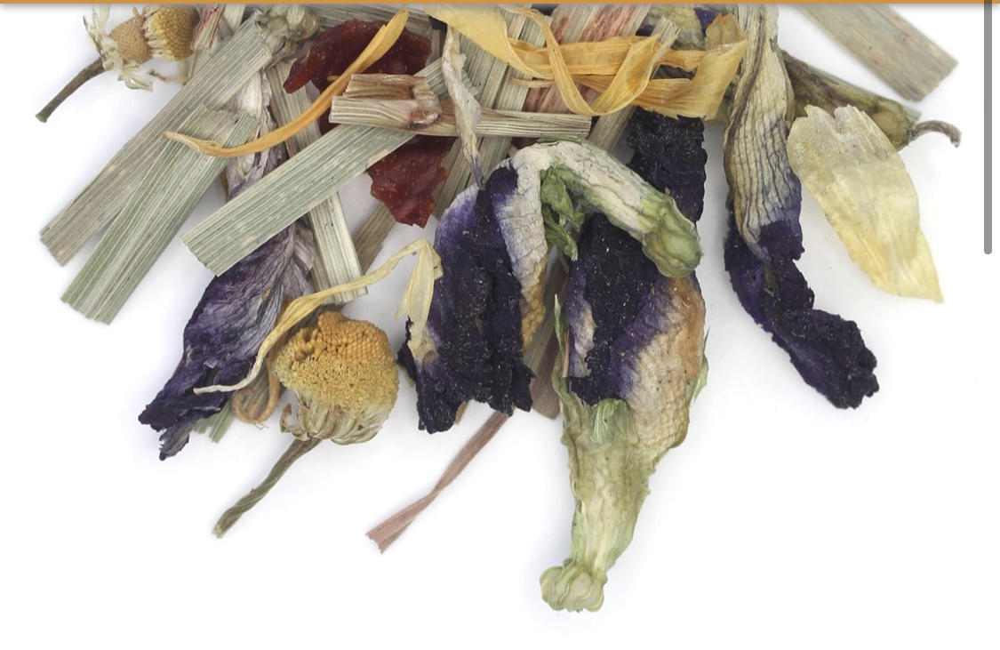 Blended With Lemon Grass, Butterfly Pea Flower, Rose Hips, Chamomile Flowers, Natural Mango Flavor, Mango Pieces, Marigold Flowers & Lychee Flavor