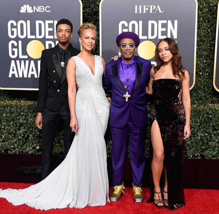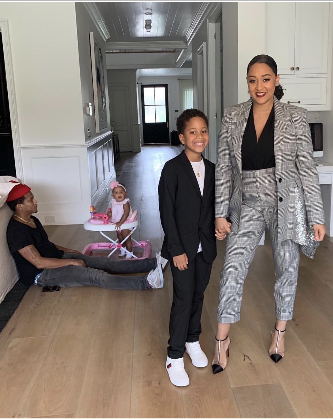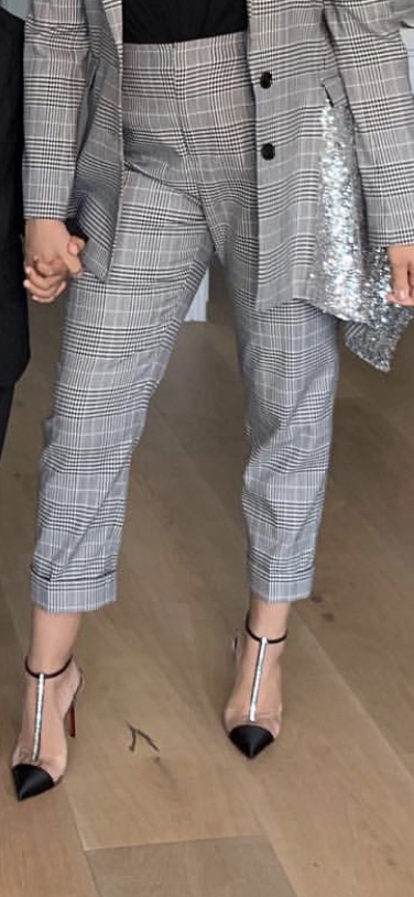 This plaid suit with sequin detail is awesome! Loving her whole outfit and family photo!